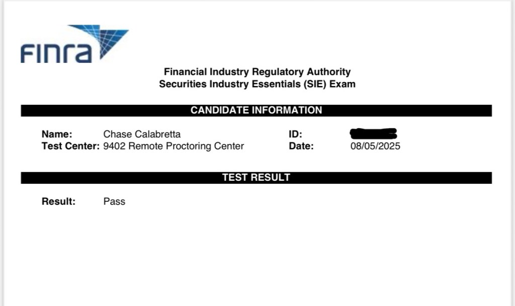 This past summer, I passed the Securities Industry Essentials (SIE) Exam, building a strong foundation in financial products and regulatory frameworks. I plan to continue expanding my credentials by pursuing the NASAA Series 66 and Life and Health (LAH) Insurance Exams this summer.